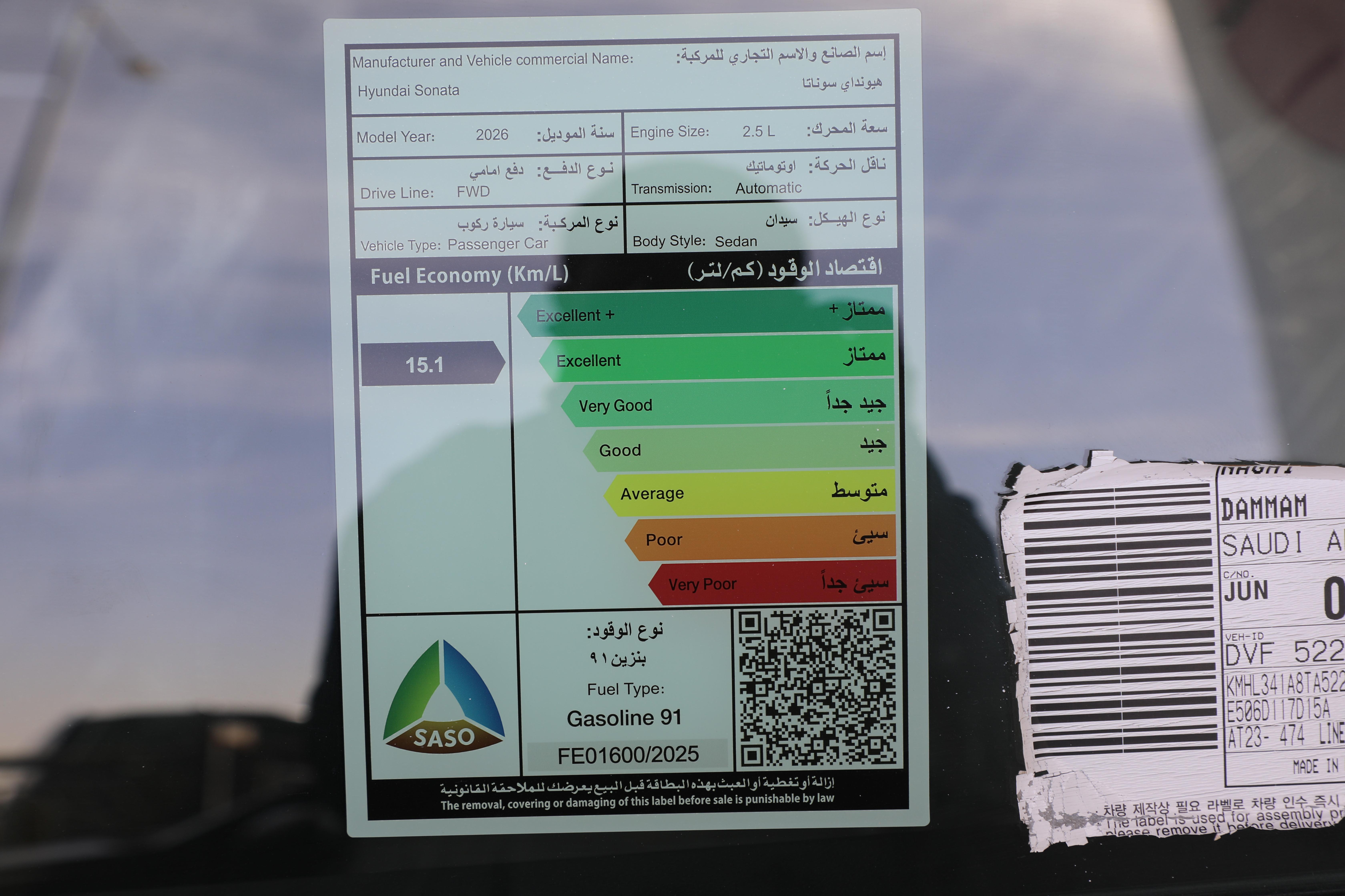 تقدّم سيارة هيونداي سوناتا سمارت 2026 أداءً متميزاً وتصميماً أنيقاً. مدعومة بمحرك 2.5 لتر وناقل حركة أوتوماتيك الذي يوفّر قيادة سلسة ومتوازنة في مختلف الظروف. ويبلغ متوسط استهلاك الوقود للسيارة نحو 15.1 كم/لتر، مما يعكس توازناً بين الأداء والكفاءة. يجمع التصميم الخارجي بين الأناقة والقوة مع خطوط انسيابية تمنح حضوراً مميزاً على الطريق. في المقصورة، توفر السيارة مزايا راحة تشمل تشغيل بصمة, تشغيل المحرك عن بُعد, زر تشغيل المحرك, فرامل يد كهربائية. وتأتي السيارة مزودة بأنظمة أمان حديثة مثل نظام مراقبة ضغط الهواء في الإطارات (TPMS), وسائد هواء أمامية (SRS), نظام الفرامل المانعة للانغلاق (ABS), نظام المساعدة في ثبات السيارة