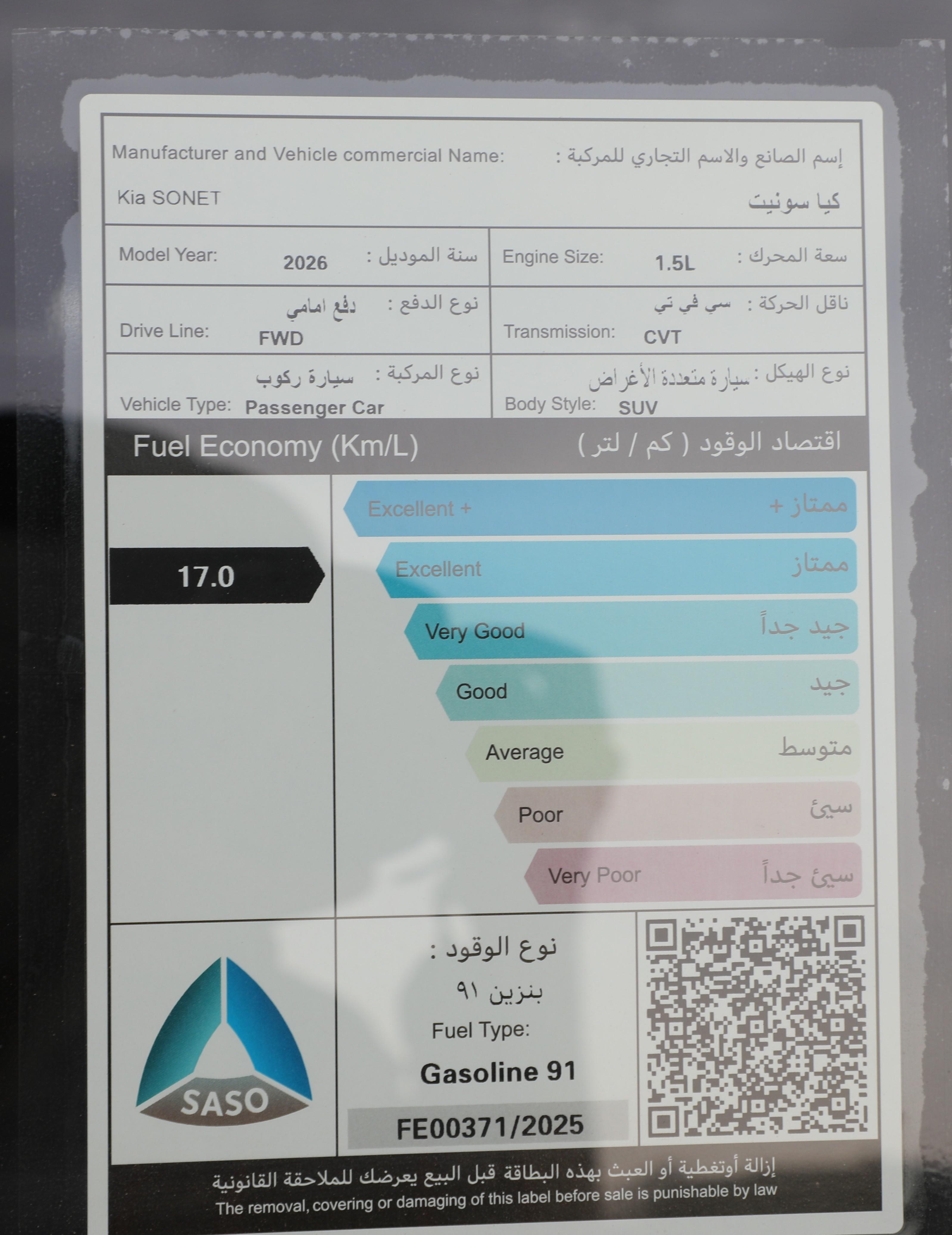 كيا سونيت 1.5 EX 2026 تجمع بين الأناقة العصرية والتكنولوجيا المتطورة لتمنحك تجربة قيادة فريدة من نوعها (SUV) تجمع بين الأداء القوي والاقتصاد في استهلاك الوقود، مع تصميم خارجي أنيق ولمسات داخلية راقية توفر أقصى درجات الراحة والرفاهية. بفضل محركها سعة 1.5 لتر وقوتها العملية